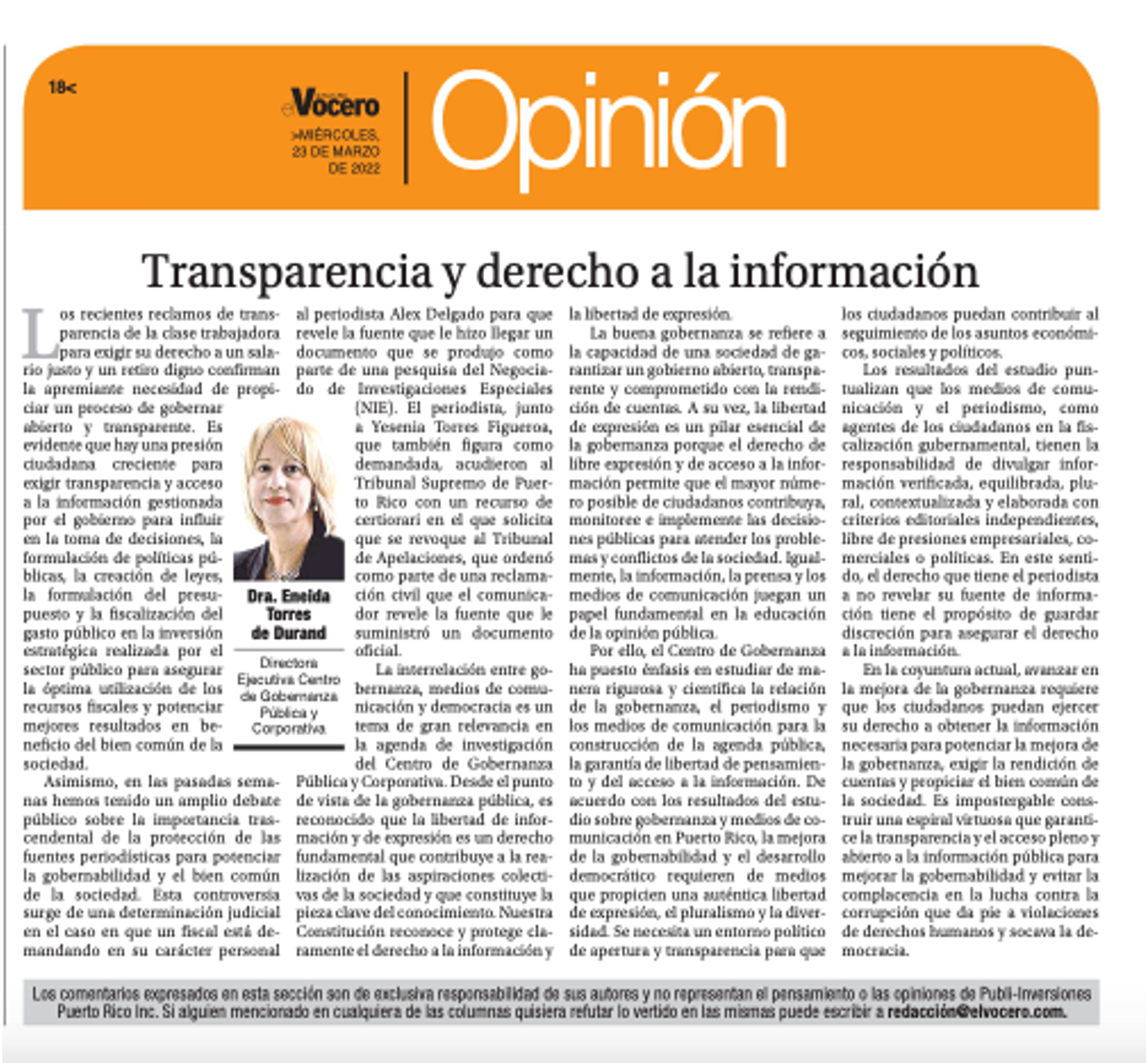 - Transparencia y derecho a la información– El Vocero, 23 de marzo de 2022